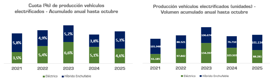 En los diez meses de 2025, se acumula un total de 733.679 unidades, lo que supone un aumento del 42,1% con respecto al mismo periodo del año anterior y una cuota del 38,4% de la producción total.