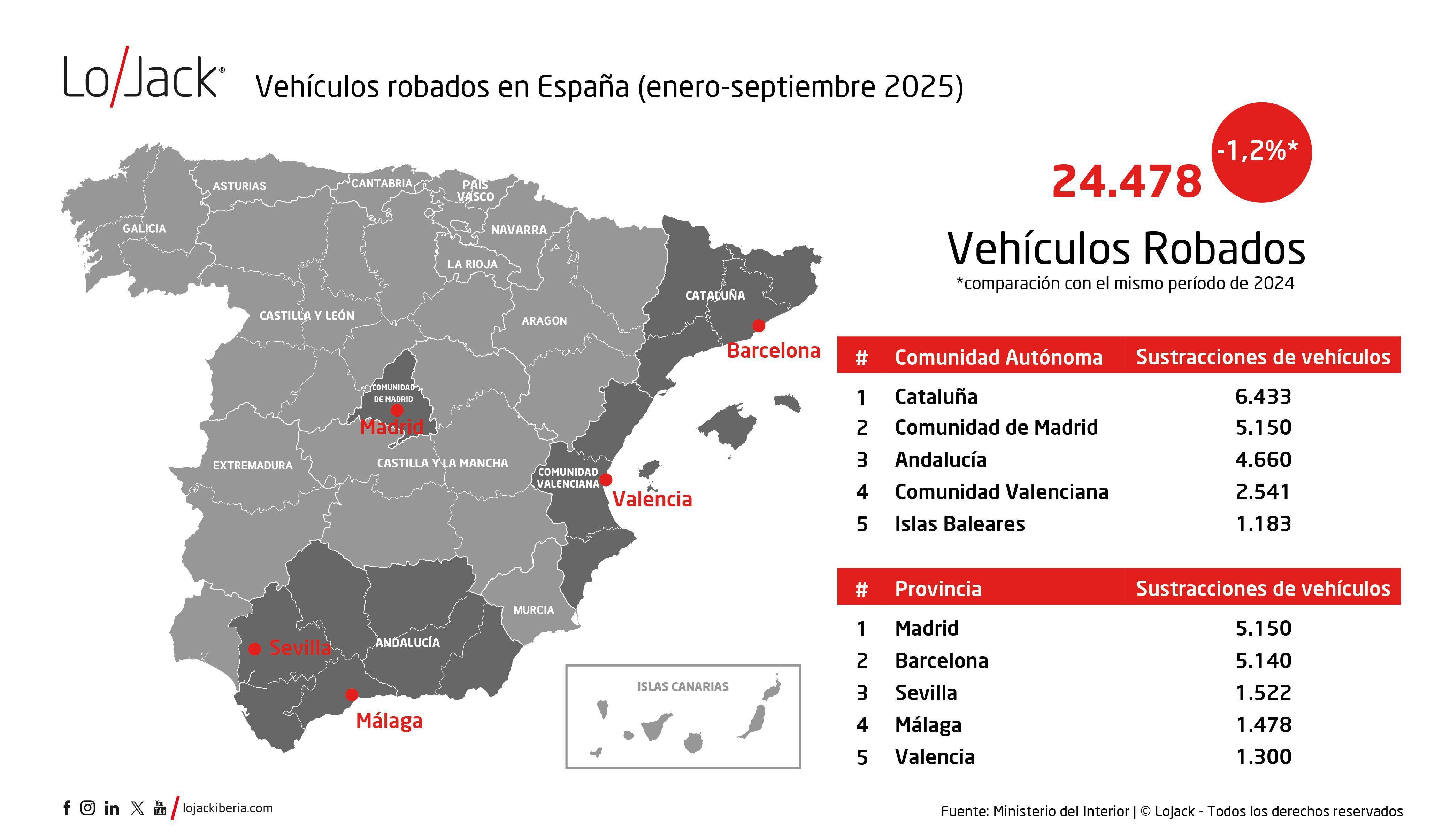 - 24.478 vehículos fueron robados en España entre enero y septiembre de 2025, un 1,2 % menos que en el mismo periodo del año anterior