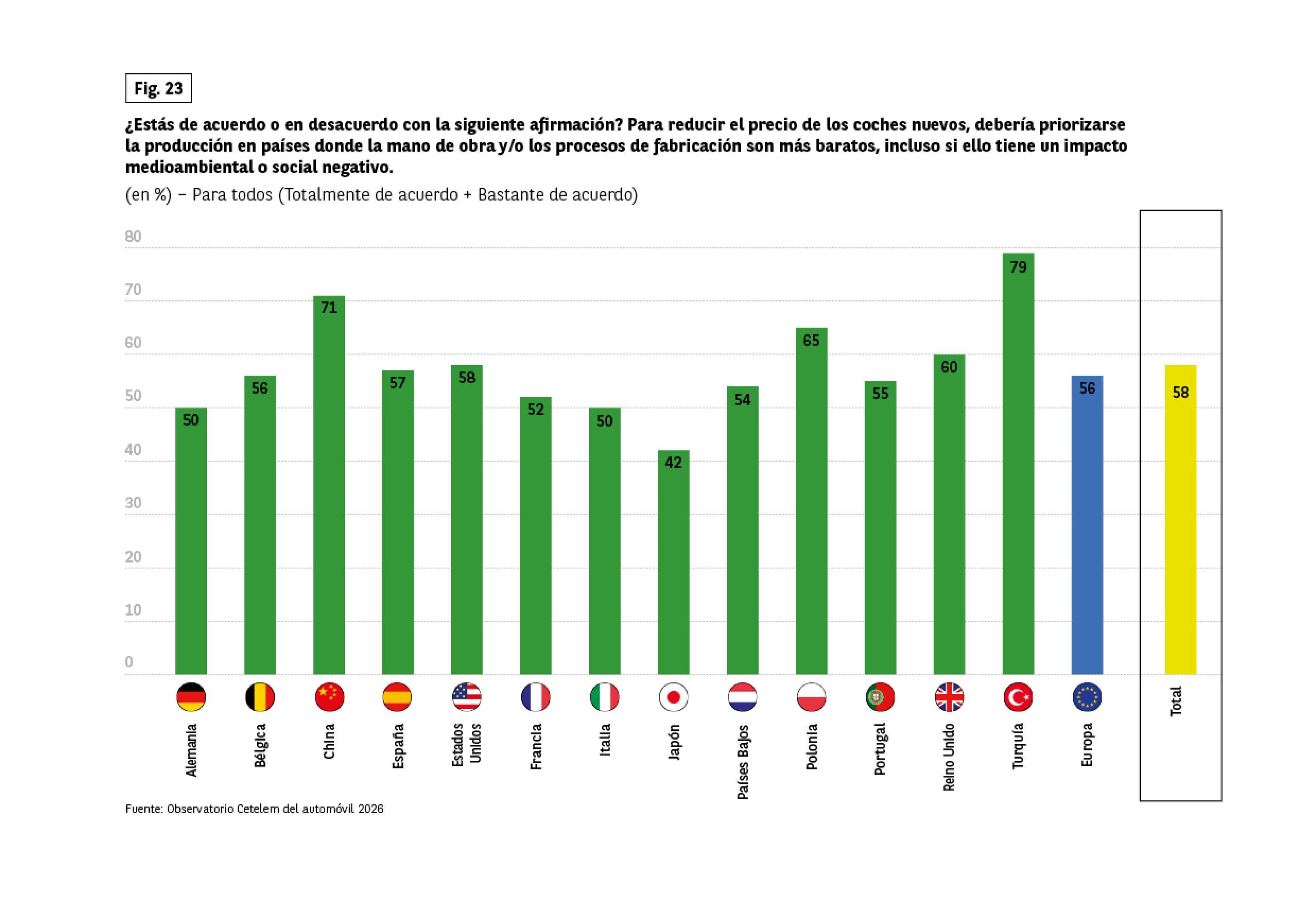 El 57% de los españoles es partidario de fabricar vehículos en países donde los costes sean menores, incluso si esto pudiera generar un impacto social o medioambiental negativo. Este porcentaje se sitúa ligeramente por encima de la media europea que alcanza el 56% y coloca a España por delante de Alemania e Italia, que alcanzan el 50%, así como de Francia, cuyo apoyo a esta medida es del 52%. A nivel internacional, el grado de aceptación español es comparable al de Estados Unidos y Reino Unido, aunque todavía está lejos de países como China donde la aprobación de esta medida alcanza el 71% de respaldo.