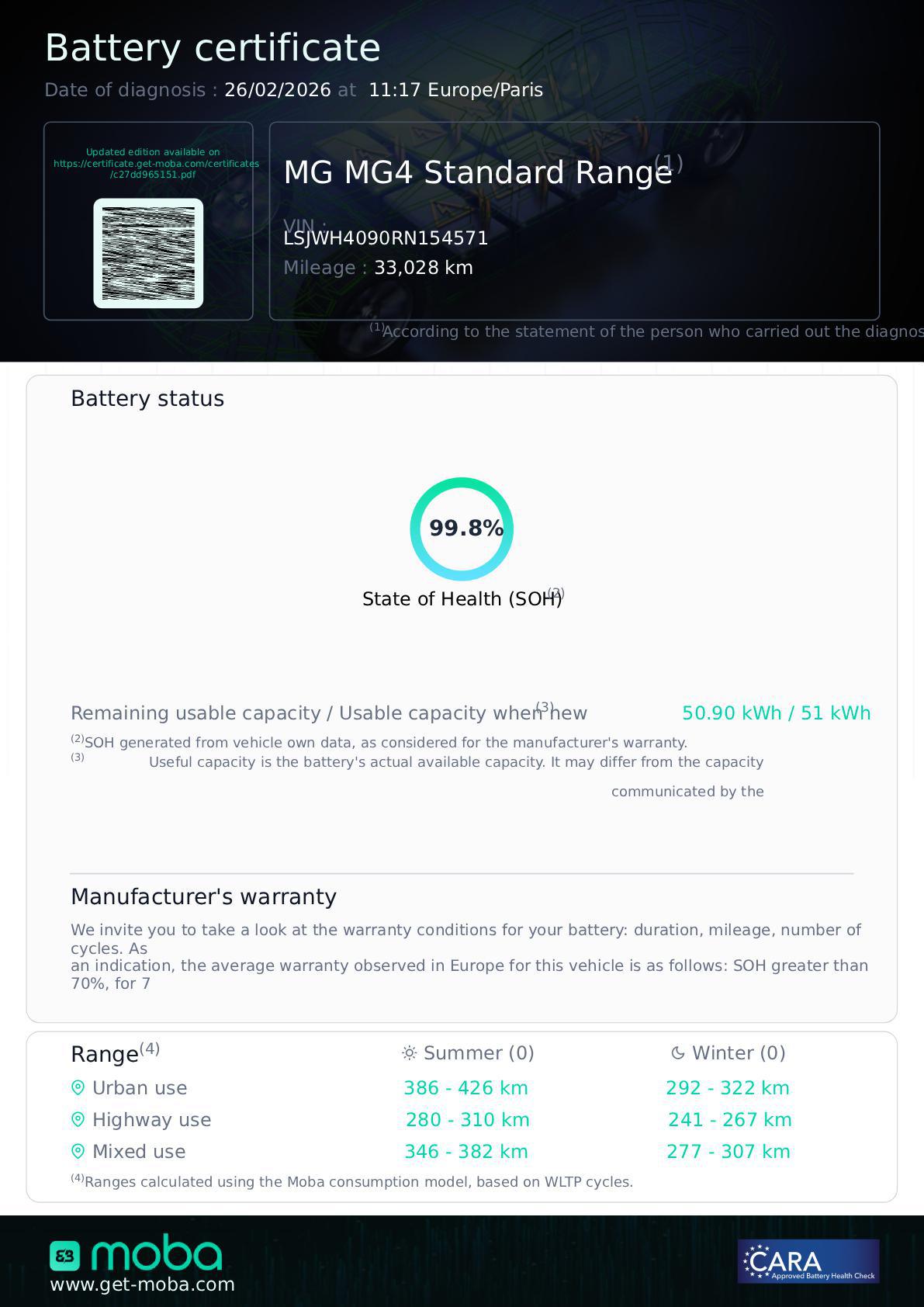 A través del portal Autoselect, los clientes interesados en vehículos usados de Arval tienen acceso a un código QR para cada vehículo, lo que les permite descargar el certificado de estado de la batería. Este certificado indica el porcentaje de capacidad de la batería en comparación con su estado nuevo, así como el cálculo de la autonomía en kilómetros en función del tipo de viaje (urbano, autopista, mixto) o de las condiciones meteorológicas.