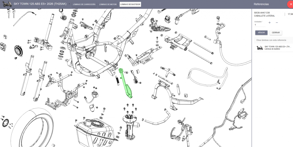 Una vez realizado el diagnóstico, los talleres solicitan directamente el recambio a KYMCO y lo reciben al día siguiente en sus instalaciones. KYMCO España pone a disposición de toda la red la plataforma e-Parts, que permite identificar y solicitar piezas de forma rápida e intuitiva.