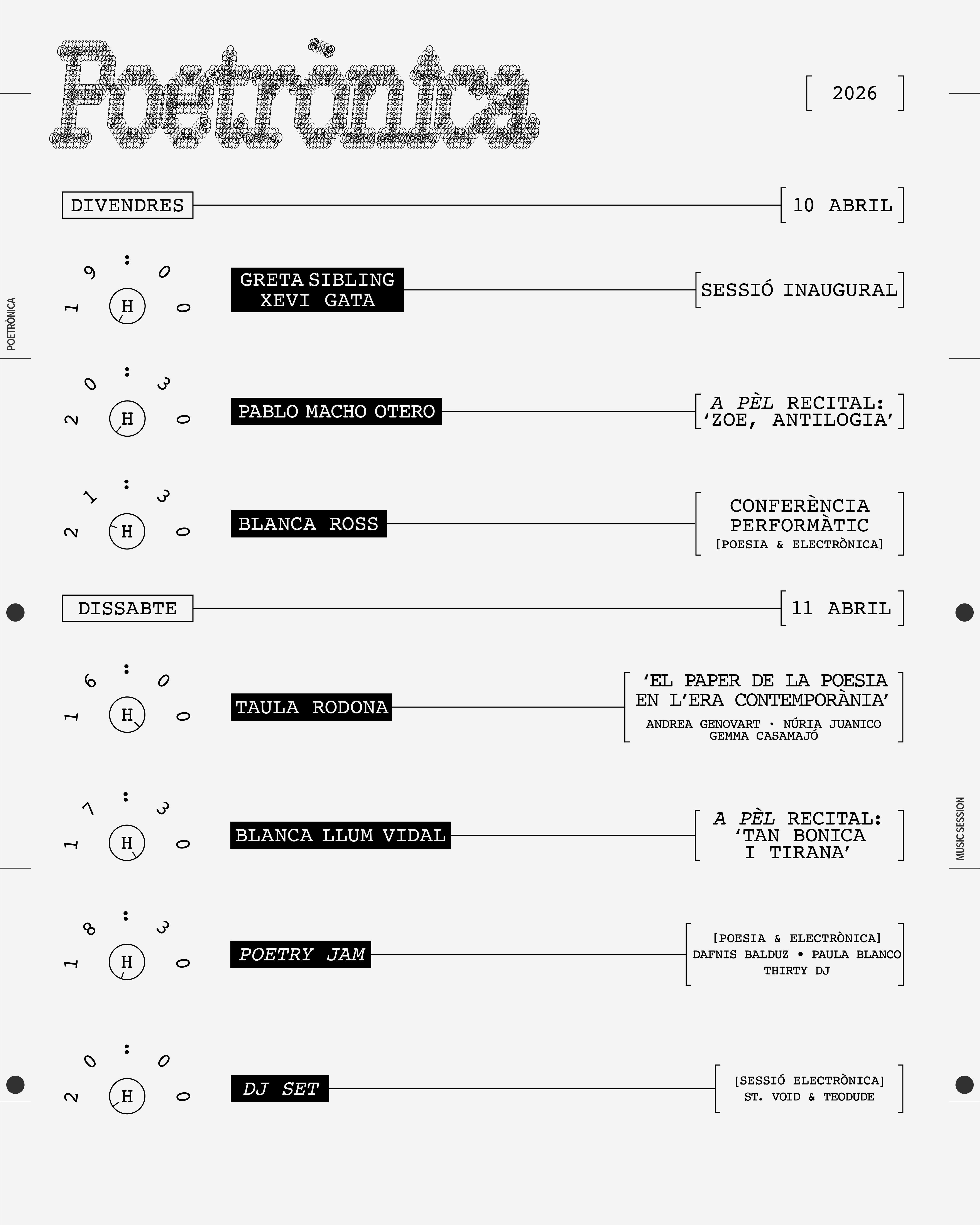 CASA SEAT celebra la segunda edición de Poetrònica, el formato de producción propia que fusiona poesía, música electrónica y performance contemporánea, que tendrá lugar el fin de semana del 10 y 11 de abril. Durante dos jornadas, el espacio acogerá a destacadas voces de la escena literaria catalana en una propuesta innovadora que explora nuevas formas de expresión artística. Con nombres como Greta Sibling, Pablo Macho Otero o Dafnis Balduz, Poetrónica se consolida como una cita imprescindible en el calendario cultural.