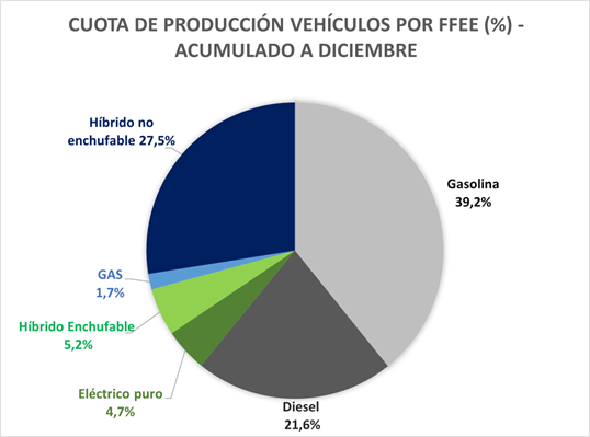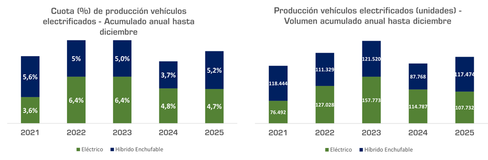 A lo largo de 2025, a pesar de la caída generalizada de la producción, se fabricaron un total de 891.290 de vehículos alternativos, un 26.1% más que el año anterior y una cuota del 39,2% de la producción total, diez puntos porcentuales más que en 2024.
